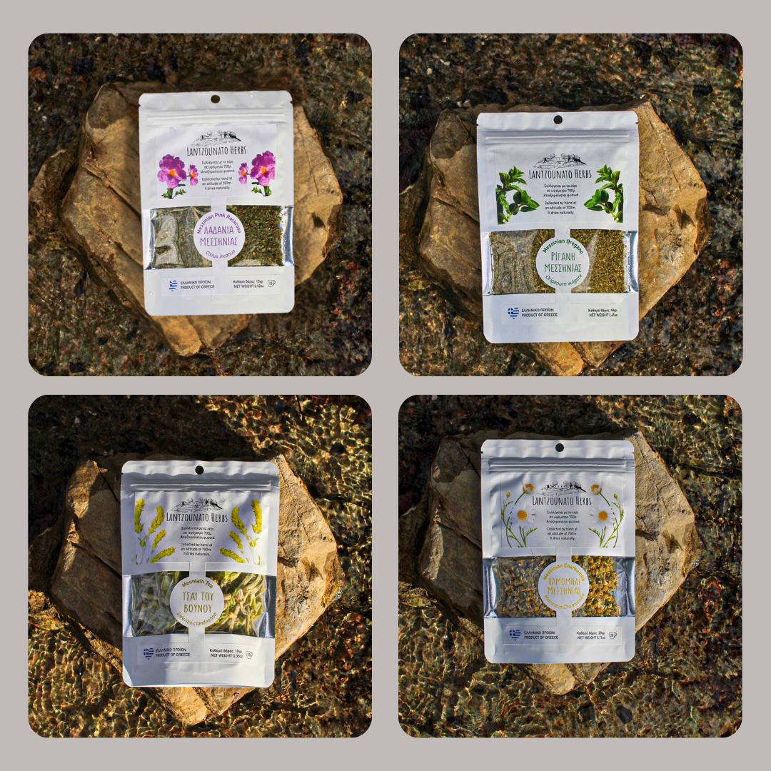 Στο Λαντζουνάτο Μεσσηνίας, σε υψόμετρο 700μ., καλλιεργούμε τα βότανά μας με παραδοσιακές μεθόδους. Συλλέγονται από εμάς με το χέρι και μεταφέρονται για αποξήρανση, χωρίς καμία παρέμβαση μηχανημάτων. Στη συνέχεια τα τρίβουμε με παραδοσιακό τρόπο μέσα σε αρίλογους και έπειτα τα συσκευάζουμε με ερμητικό κλείσιμο ώστε να διατηρούνται τα ποιοτικά χαρακτηριστικά τους, με σκοπό να τα γεύεστε σαν να κόπηκαν την ίδια μέρα!